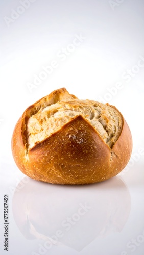 Studio shot of a single golden brown, crusty, artisan bread roll