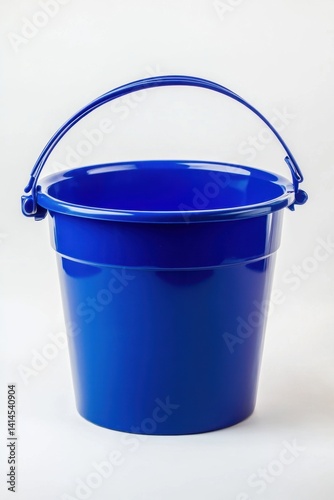 Studio shot of a vibrant blue plastic bucket with handle against a clean white background showcasing its simple design