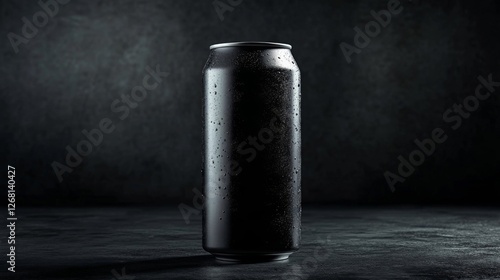 Studio Shot of Black Aluminum Can with Water Droplets on Dark Textured Backdrop