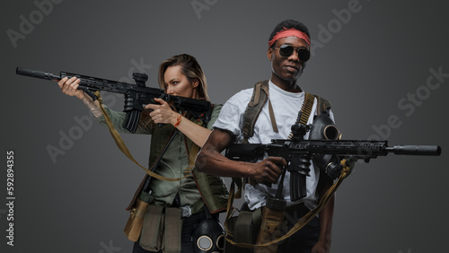 Studio shot of black macho man and woman survivors in post apocalyptic setting.