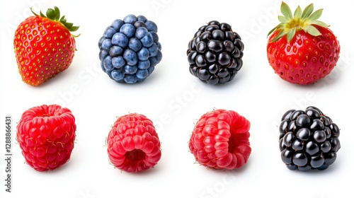 Studio shot of fresh berries against a white background. Close up view of strawberries, raspberries, blueberries and blackberries