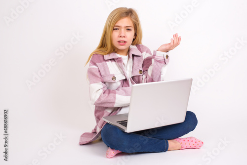 Studio shot of frustrated caucasian teen girl sitting with laptop in lotus position on white background gesturing with raised palm, frowning, being displeased and confused with dumb question.