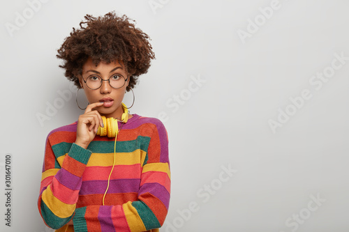 Studio shot of self assured lovely woman with natural curly hair, looks at camera, keeps finger near lips, wears round earrings, glasses and striped jumper, models against white wall, empty space