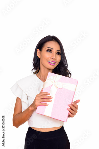 Studio shot of young happy Asian woman thinking while holding gift box isolated against white background