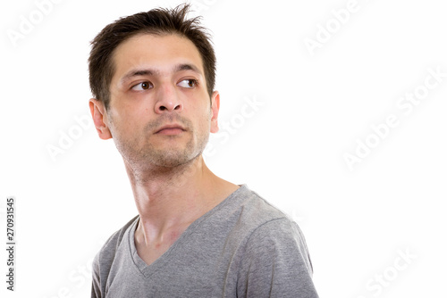 Studio shot of young man looking back while thinking