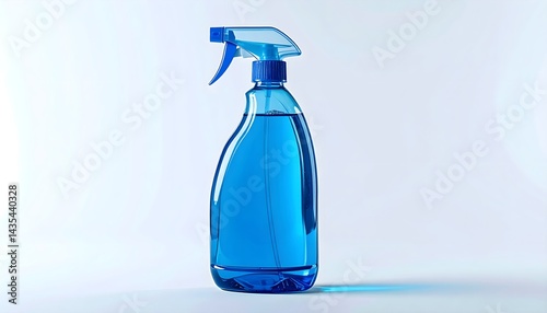 Studio-quality image of a transparent spray bottle filled with blue cleaning solution.