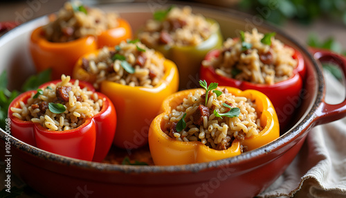 Stuffed bell peppers filled with rice and meat in colorful ceramic dish on rustic table
