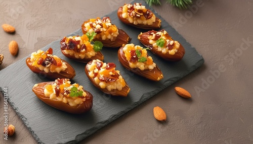 Stuffed dates with nuts and candied fruit filling on a stone or slate background. The concept of a healthy dessert. Flat lay. Top view.
