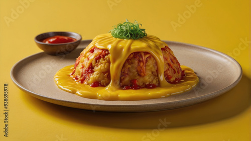 Stuffed rice with meat and tomato sauce on a yellow background.
