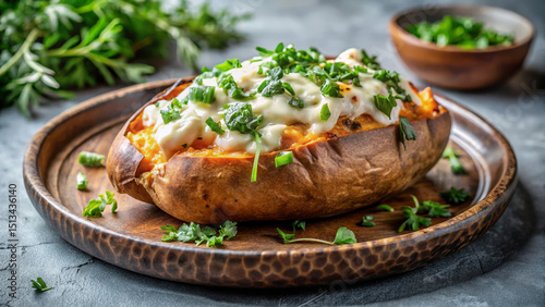 Stuffed sweet potatoes with creamy sauce and herbs on a wooden plate