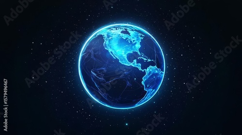 Stunning 3D representation of the Earth, illuminated by blue light against a starry background for a cosmic effect.