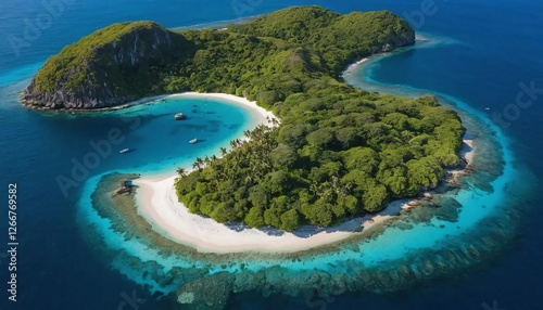 Stunning aerial view of a tropical island with lush green vegetation surrounded by turquoise ocean waters and white sandy beaches