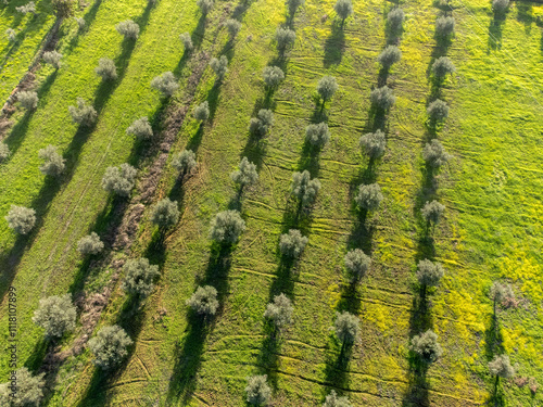 Stunning aerial view of a vast olive grove in Alentejo, Portugal, bathed in golden sunlight. A serene rural landscape showcasing natural beauty and agricultural heritage.