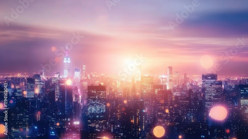 Stunning Aerial View of a Vibrant City Skyline at Sunset with Glittering Lights and Warm Colors Illuminating Iconic Skyscrapers and Landmarks