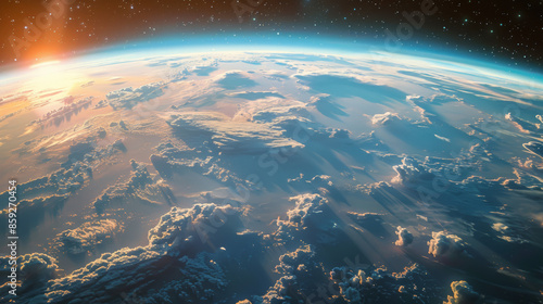 Stunning aerial view of earth's surface from space, showcasing delicate transition from night to day with ethereal sunlight, cloud formations, and starry cosmos backdrop.