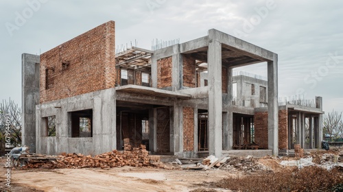 Stunning Aerial View of Modern Concrete Structure Under Construction, Featuring Brick Facade Ideal for Progressive Architecture and Urban Development Projects.