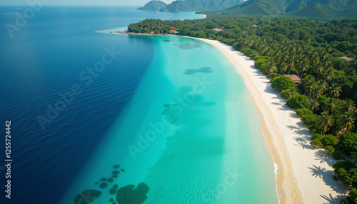 Stunning Aerial View of Tropical Beach Turquoise Water White Sand Palm Trees