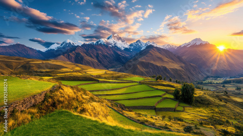 Stunning Andes mountains at dawn with vibrant green fields and golden sunlight illuminating landscape, creating serene and breathtaking view