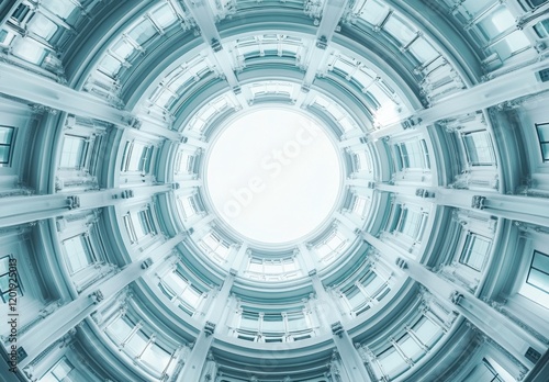 Stunning Architectural View of Circular Skylight Surrounded by Elegant Columns and Windows with a Soft Blue Hue, Evoking a Sense of Tranquility and Modern Design