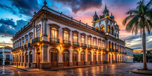 stunning architectural view of historic building at dusk, showcasing intricate details and warm lighting against dramatic sky. scene captures essence of Brazilian heritage and beauty