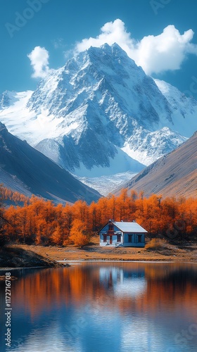 Stunning Autumn Photo: Serene Lakeside Cabin Majestically Framed by Snow-Capped Mountains. AI Generated