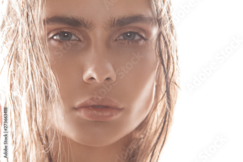 Stunning beautiful wet hair and golden skin model girl stripped in lingerie on white isolated font background with shining