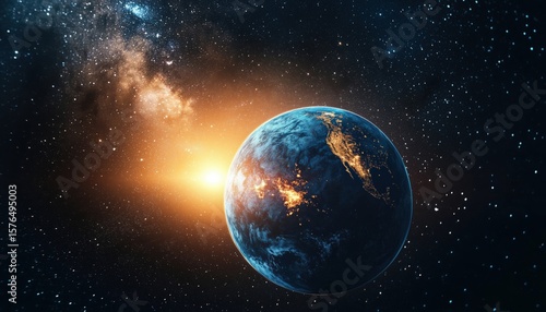 Stunning Blue Planet Earth In The Vastness Of Space With Stars, Milky Way, And A Majestic Sunrise. Awe-Inspiring Sunlight On Our World.