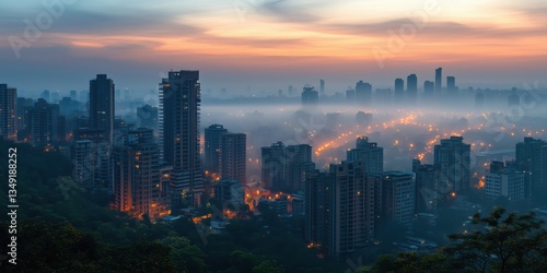Stunning cityscape at dawn with misty skyline and glowing city lights