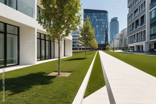 Stunning Close-Up of a Clean Pathway Next to Modern Urban Buildings in a City Landscape