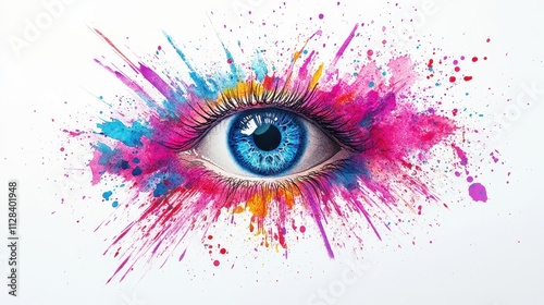 Stunning Close-Up of a Vibrant Blue Eye Surrounded by Colorful Paint Splashes Creating an Eye-Catching Artistic Composition for Creative Projects