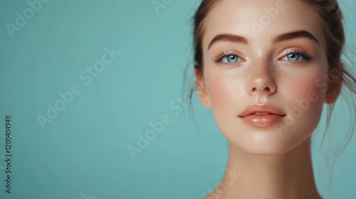 Stunning Close-up Portrait of a Young Woman with Freckles and Blue Eyes Against a Teal Background
