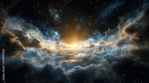 Stunning cosmic scene featuring dense clouds illuminated by distant stars, creating breathtaking