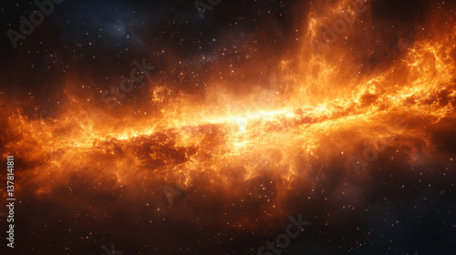 stunning cosmic scene featuring vibrant explosion of orange and yellow hues, resembling galaxy or nebula filled with stars and cosmic dust. image evokes sense of wonder and vastness of space