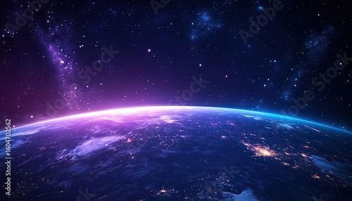Stunning Cosmic View: Vibrant Earth From Space Shining With Purple And Blue Hues, Harmony Between Earth And Space, Creating A Picture-Perfect Scene.
