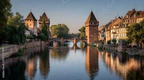 Stunning Detailed Editorial Photograph of the Scenic Ponts over the Serene Waterway in a European Town at Sunrise