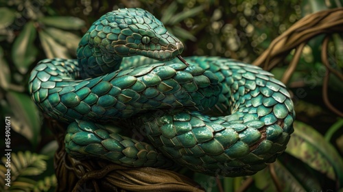 Stunning Emerald Green Snake Coiled on a Branch, Generative AI