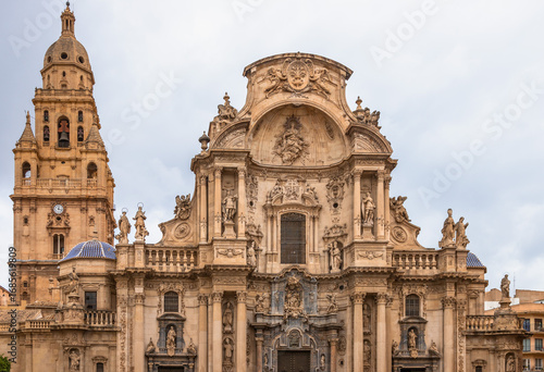 Stunning facade of Murcia Cathedral in Spain, showcasing intricate Baroque architecture, detailed sculptures, and historical charm under a cloudy sky