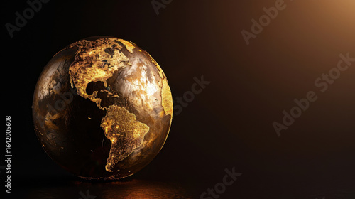 Stunning globe showcasing Americas with golden tones, symbolizing global business growth and prosperity. warm light enhances rich textures and details of continents, creating inspiring visual