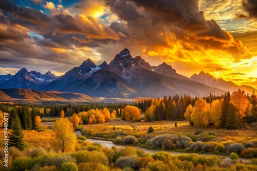 Stunning Golden Landscape at Sunrise with Majestic Mountains and Vibrant Sky Illuminating Nature