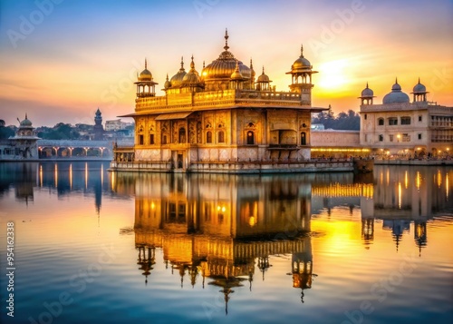 stunning golden temple reflection mirrored in calm lake waters at dusk with majestic mountains in background warm golden light peaceful ambiance