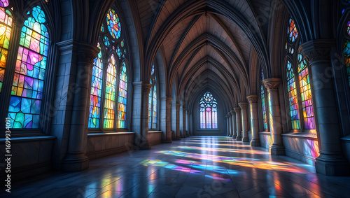 Stunning gothic cathedral interior illuminated by colorful stained glass windows casting vibrant light patterns