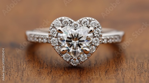 Stunning heart-shaped diamond ring on a wooden surface, perfect for love and engagement.