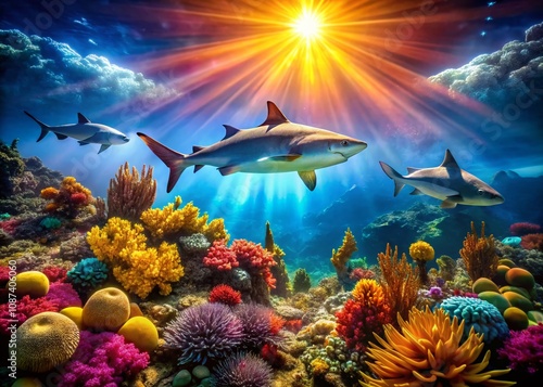 Stunning High Depth of Field Shark Background Wallpaper Featuring Majestic Sharks Swimming Gracefully Through Crystal Clear Ocean Waters with Vibrant Coral Reefs and Sunlight Filtering Throughthe Wave