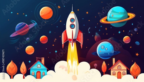 Stunning Illustration House Soaring Through Space Amidst Cosmic Backdrop, Showcasing Vivid Colors and Textures in a Surreal Galactic Setting