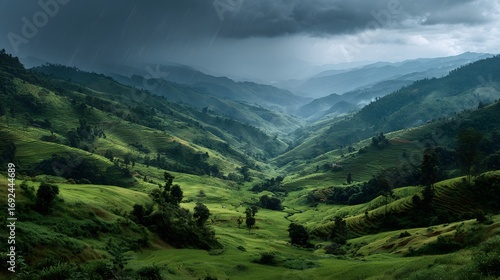 Stunning landscape of terraced green rice paddies in the mountains. Dramatic, dark storm clouds gather overhead in this moody, atmospheric, photorealistic scene.