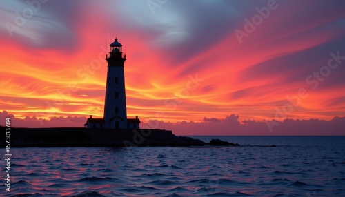 Stunning Lighthouse at Sunset with Colorful Sky and Ocean Waves Reflection