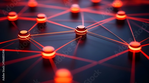 Stunning minimalistic composition of a futuristic technological network composed of glowing red nodes interconnected by intricate lines forming abstract geometric patterns against a dark red gradient