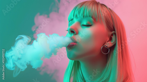 Stunning model with elegant earrings exhales smoke, eyes partly closed, showcasing a futuristic vibe in vibrant colors.
