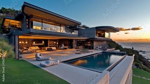 Stunning Modern Villa with Breathtaking Ocean Views and Luxurious Swimming Pool at Sunset