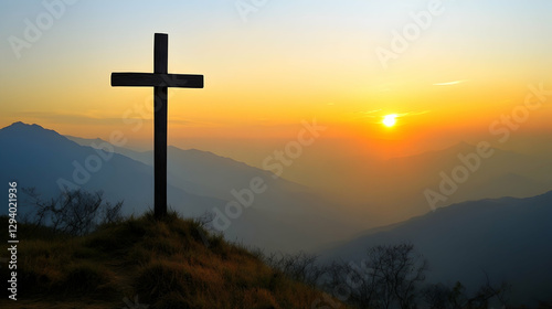 Stunning mountaintop view with a wooden cross silhouetted against a golden sunrise, representing hope and faith